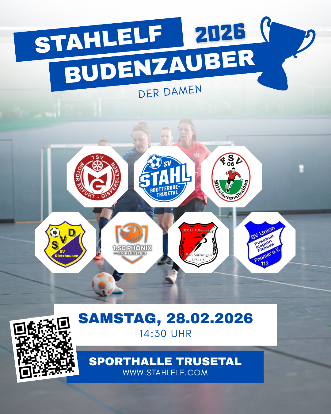 Alle Jahre wieder steigt in der Sporthalle Trusetal der jährliche Budenzauber. Auch in diesem neuen Jahr 2026 wartet der SV Stahl mit Turnieren in allen Altersklassen auf. Hier die Übersicht über alle Turniere, wir freuen uns auf Euren Besuch! Für die Verpflegung und gute Unterhaltung wird wie immer bestens gesorgt sein.