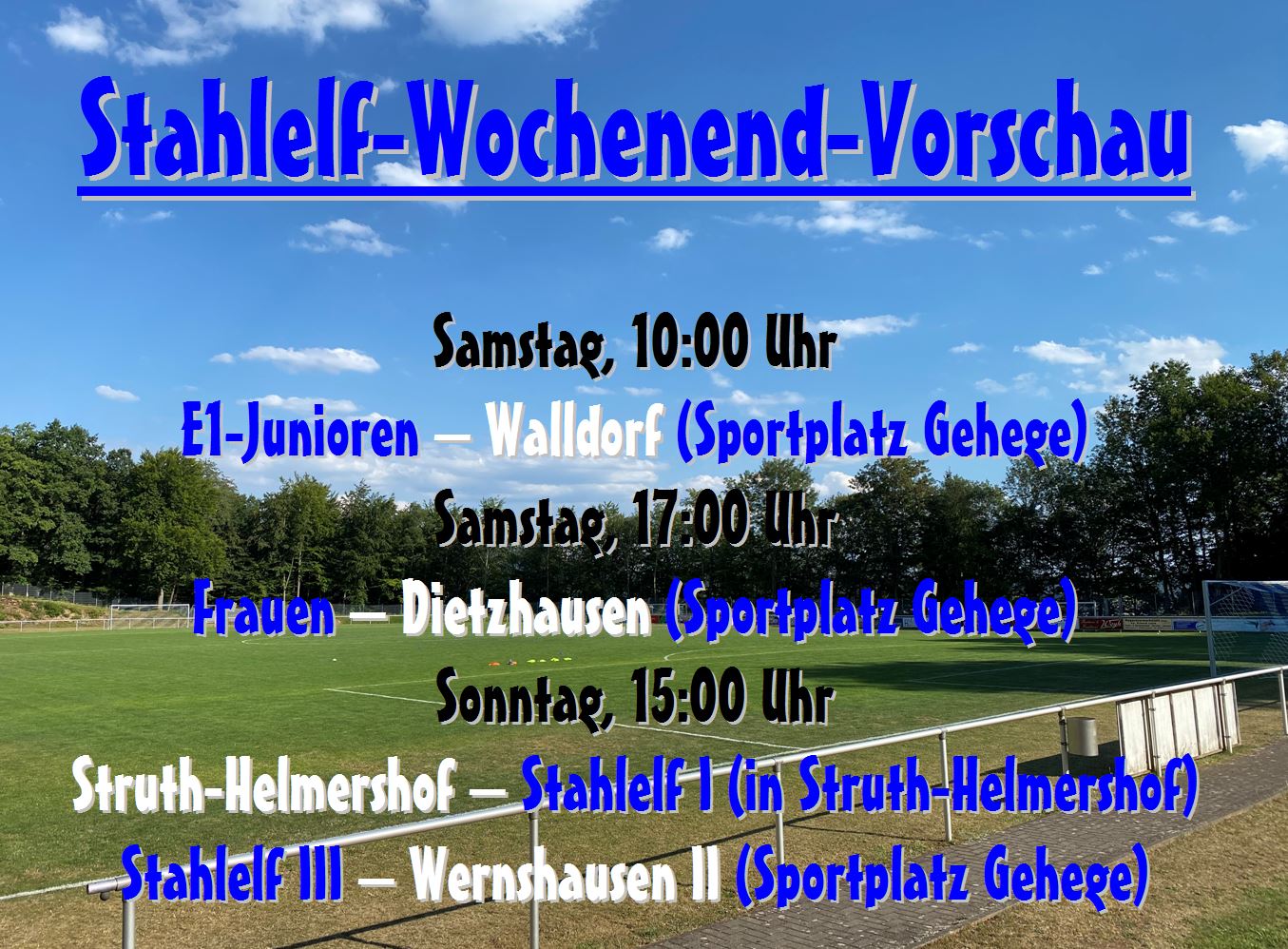 Auch am kommenden Wochenende stehen für die Stahlelf-Teams Spiele auf dem Programm. Während alle Erwachsenen-Mannschaften im Punktspiel-Einsatz sind, hat beim Nachwuchs nur unsere E1-Mannschaft ein Spiel. Zum Spiel der Kreispokal-Ausscheidungsrunde empfangen unsere E1-Junioren am Samstagvormittag um 10.00 Uhr Walldorf im "Gehege". Spannung dürfte in diesem Spiel garantiert sein, unser Nachwuchs würde sich über zahlreiche Unterstüzung im Trusetaler "Gehege" sicher sehr freuen! Alle anderen Nachwuchteams haben am kommenden Wochenende spielfrei.