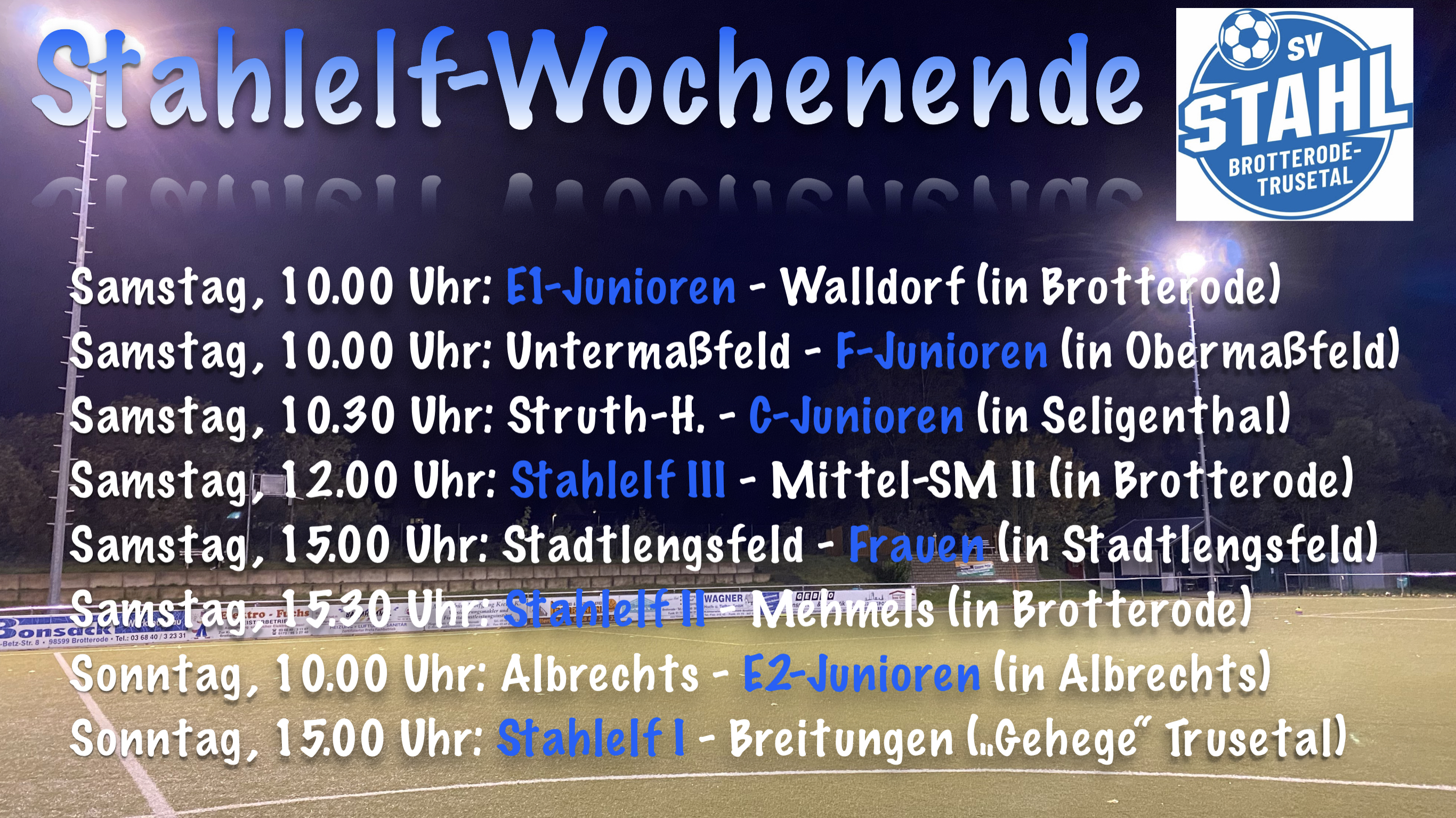 WICHTIGER HINWEIS: Aufgrund der Witterung und des Dauerregens findet von den Heimspielen nur das Spiel der Ersten Mannschaft gegen Breitungen am Sonntag auf dem Trusetaler Rasenplatz im „Gehege“ statt, die anderen Heimspiele unserer Teams sind allesamt auf den Kunstrasen nach Brotterode verlegt worden!