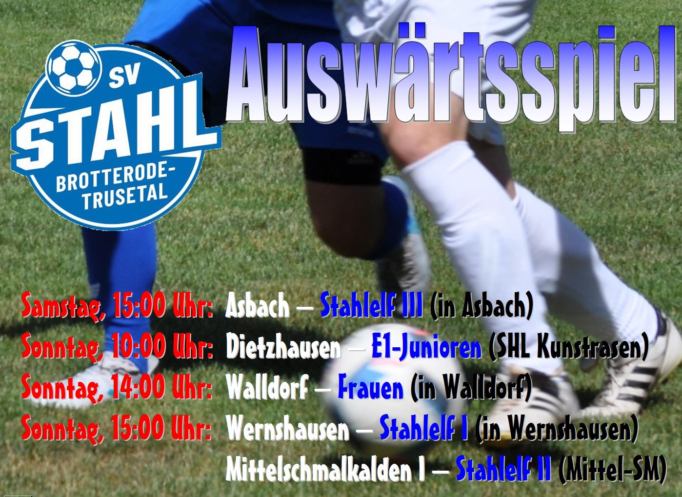 Am kommenden Wochenende treten alle Teams der Stahlelf auf fremden Platz an. Spielfrei sind unsere C-Junioren, die E2-Junioren und die F-Junioren. Den Anfang macht unsere Dritte Mannschaft am Samstagnachmittag mit dem Auswärtsmatch beim VfB Hachelstein Asbach. Sicherlich keine leichte Aufgabe für unsere Dritte. Asbach liegt allerdings nur 2 Punkte vor unsererm Team und hat in den bisherigen 5 Spielen einen Sieg mehr eingefahren, als unsere Mannschaft. Nach dem verpassten Sieg gegen Mittelschmalkalden II sollte unser Team nun engagiert und konzentriert zu Werke gehen und sollte vor allem bei der Chancenverwertung besser agieren. Spielbeginn ist am Samstag um 15 Uhr auf dem Sportplatz in Asbach.