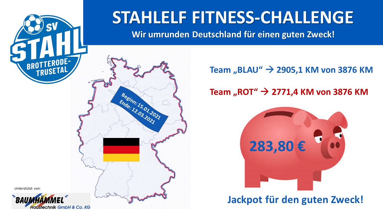 Mittlerweile sind wir in der 8. und letzten Woche unserer Stahlelf-Fitness-Challenge und es geht in den Endspurt. Bis zum 12.März läuft unsere Aktion und beide Teams haben schon gute Kilometer absolviert. Ob es bis zum kommenden Freitag reicht, Deutschland zu umrunden wird aber sehr eng werden. Beide Teams sollten das für die kommenden Tage angekündigte gute Laufwetter nutzen, um noch einmal Gas zu geben und fleißig Kilomter zu sammeln.