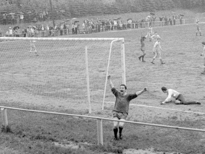 Legendäres Spiel, legendäres Foto: Torjubel von Reiner 1987 beim Heimsieg gegen Geisa (5:1):