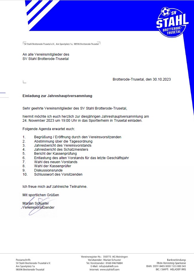 Der SV Stahl Brotterode-Trusetal führt am Freitag, dem 24.11.2023, seine diesjährige Jahreshauptversammlung durch. Diese findet im Sportlerheim im "Gehege" in Trusetal statt. Beginn der Versammlung ist um 19.00 Uhr. Hierzu sind alle Vereinsmitglieder herzlich eingeladen.