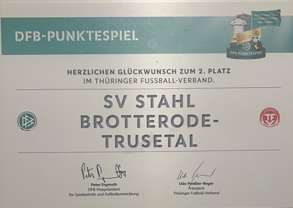 Der SV Stahl Brotterode-Trusetal darf sich über eine besondere Auszeichnung freuen. Beim bundesweit durchgeführten DFB-Punktespiel landete unser Verein im Bereich des Thüringer Fußballverbands auf einem tollen zweiten Platz. Gemeinsame Sieger wurden die beiden punktgleichen Vereine FSV 06 Eintracht Hildburghausen und VfB Oberweimar, Dritter der BSV Eintracht Sondershausen. Glückwunsch an dieser Stelle natürlich auch an die anderen Sieger-Vereine!