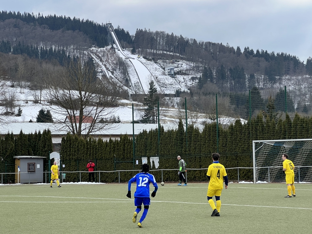 Die Stahlelf-Reserve war auf dem Kunstrasenplatz in Brotterode zunächst das bestimmende Team und kam nach sechs Minuten zur ersten Möglichkeit des Spiels. Nach einem Eckball verfehlte Dupkes Kopfball das Steinbach-Hallenberger Gehäuse um nur wenige Zentimeter. Nach einer knappen Viertelstunde hatten sich die Gäste besser sortiert. Sie tauchten in der 12.Spielminute erstmals gefährlich am gegnerischen Strafraum auf, konnten allerdings von der gut gestaffelten Hintermannschaft noch am Abschluss gehindert werden. Kurz danach gelang dies nicht und Hermann konnte freistehend abschließen. Der Ball ging allerdings am langen Pfosten vorbei. Auf der Gegenseite brachte Kuhn das Leder von rechts in die Strafraummitte, wo Ullrich den Ball in höchster Not vor den einschussbereiten Angreifern der Hausherren über das eigene Tor zur Ecke klärte. Die Stahlelf hatte gute Ansätze, vollendete die Angriffe aber zunächst viel zu selten. Die Quittung folgte in der 32.Minute. Nach einem überflüssigen Foul in der Mitte zirkelte Bischoff den fälligen Freistoß auf das Tor, Schlussmann Scheffler wehrte sowohl den Freistoß als auch den ersten Nachschuss noch reaktionsschnell ab, musste sich aber dann beim zweiten Nachsetzer von Marvin Klee geschlagen geben und die Gäste gingen damit in Führung. Kurz vor dem Seitenwechsel hatte Dupke dann noch eine Möglichkeit zum Ausgleich, doch Gästekeeper Lange hatte damit dem Abschluss aus 18 Metern keine Probleme.