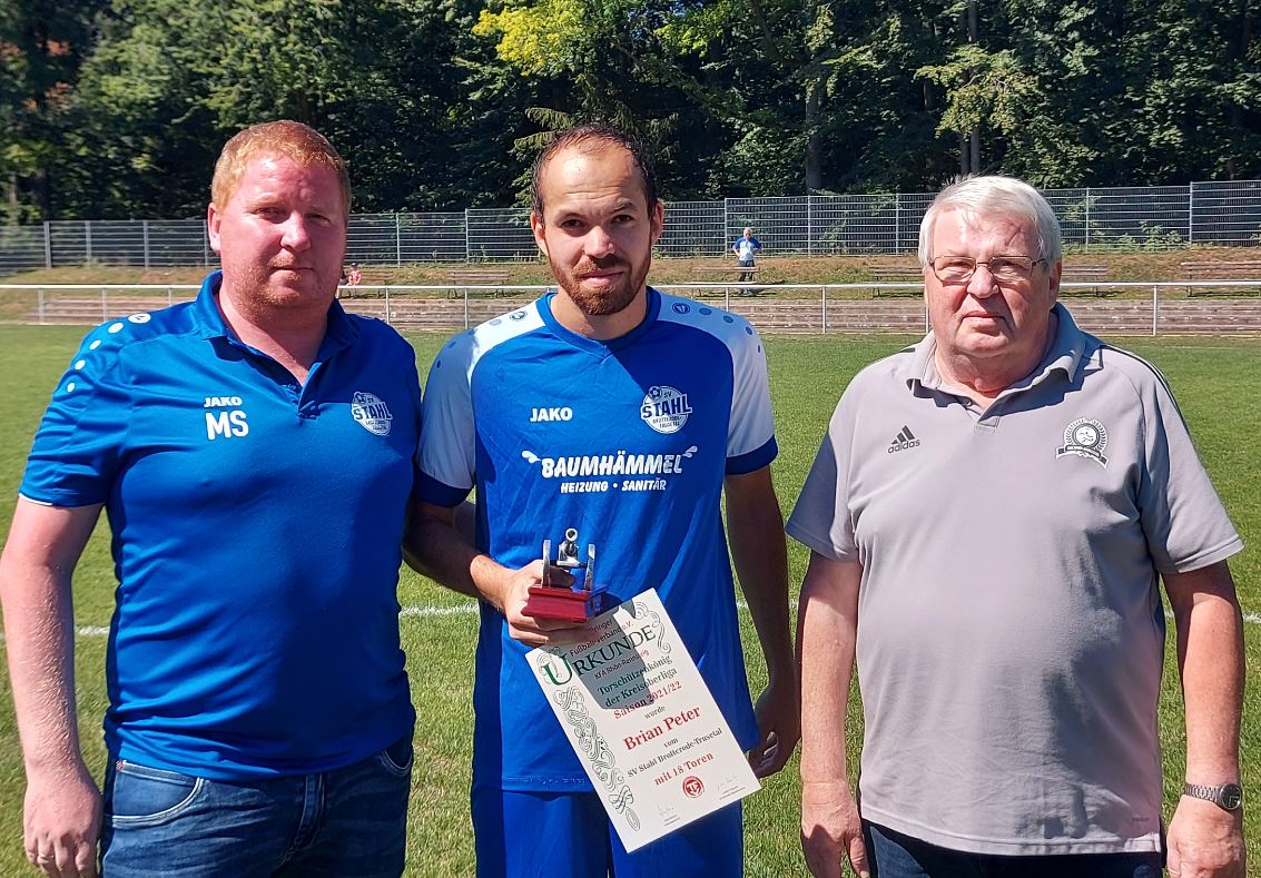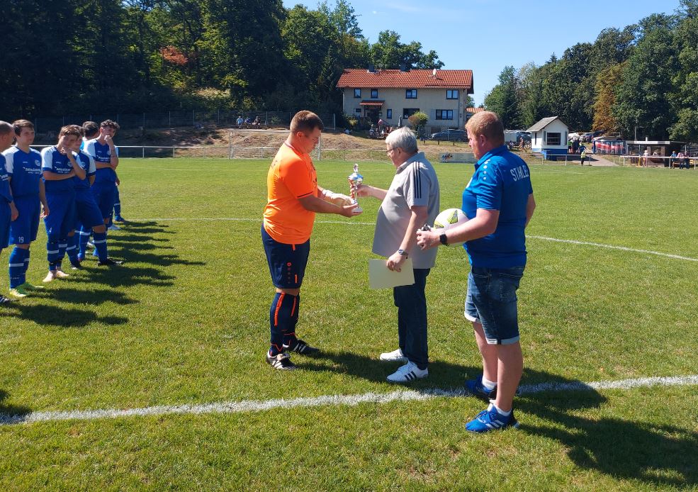 Vor dem Anpfiff unseres Heimspiels gegen Steinbach-Hallenberg II wurden unsere Stahlelf und unser Spieler Brian Peter noch für die vergangene Saison geehrt. Die Ehrung führten der Spielausschuss-Vorsitzende des KFA Rhön-Rennsteig Günter Schuster und unser Vereinsvorsitzender Marian Schuster durch. Neben dem 2.Platz der Kreisoberliga-Saison 2021/22, für den es eine Ball und eine Urkunde gab, wurde unsere Erste Mannschaft noch mit dem Fairplay-Pokal und einer Geldprämie vom KFA Rhön-Rennsteig ausgezeichnet, da unsere Mannschaft einen hervorragenden 1.Platz in der Fairplay-Wertung der Kreisoberliga erreicht hat. Darüber hinaus wurde Brian Peter noch die Torjäger-Kanone für die abgelaufene Saison überreicht. Den Titel des Torschützenkönigs 2021/22 teilt er sich mit Marcel König von der SG Kalten/Rhön, der ebenfalls 18 Treffer erzielen konnte. Unser Torjäger benötigte hierfür allerdings lediglich 15 Spiele, sein Konkurrent aus der Rhön absolvierte 24 Partien. Zu erwähnen ist zudem, dass unsere Dritte Mannschaft in der Fairplay-Wertung der 1.Kreisklasse den zweiten Platz belegte und ebenfalls ausgezeichnet wurde. An dieser Stelle Glückwunsch an unsere Mannschaften und an Brian Peter zu den Auszeichnungen!