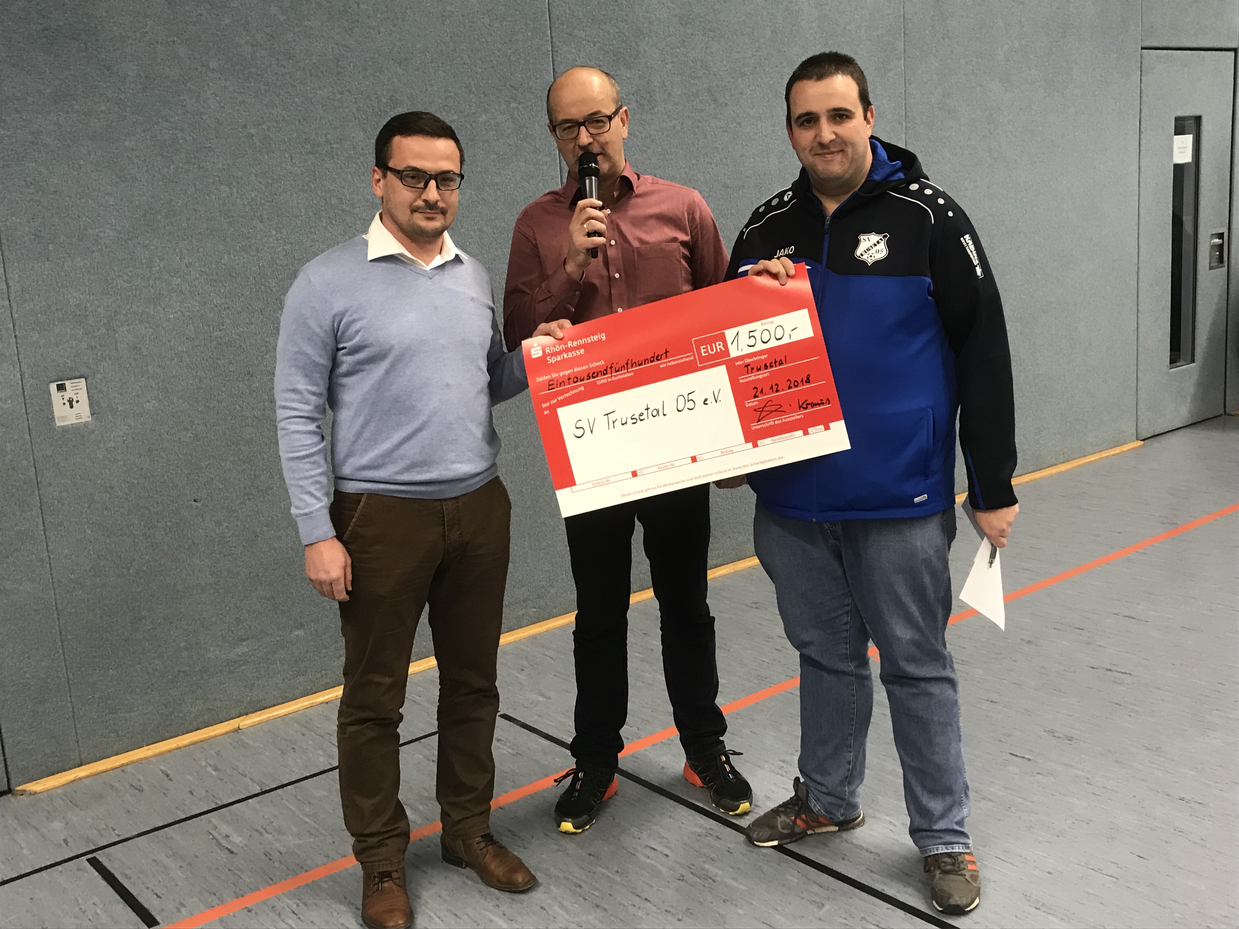 Die Rhön-Rennsteig-Sparkasse hat dem SV Trusetal 05 kurz vor Weihnachten eine tolle Überraschung präsentiert und den Verein mit einer sehr großzügigen Spende unterstützt. Auf Empfehlung des Landratsamtes Schmalkalden-Meiningen wurde dem Trusetaler Fußballverein eine Spende in Höhe von 1500,- € als Zuwendung zur Verfügung gestellt. Damit wird die Vereinsarbeit im Rahmen des Projektes "Sportplatzgestaltung Sportanlage im Gehege" gefördert.