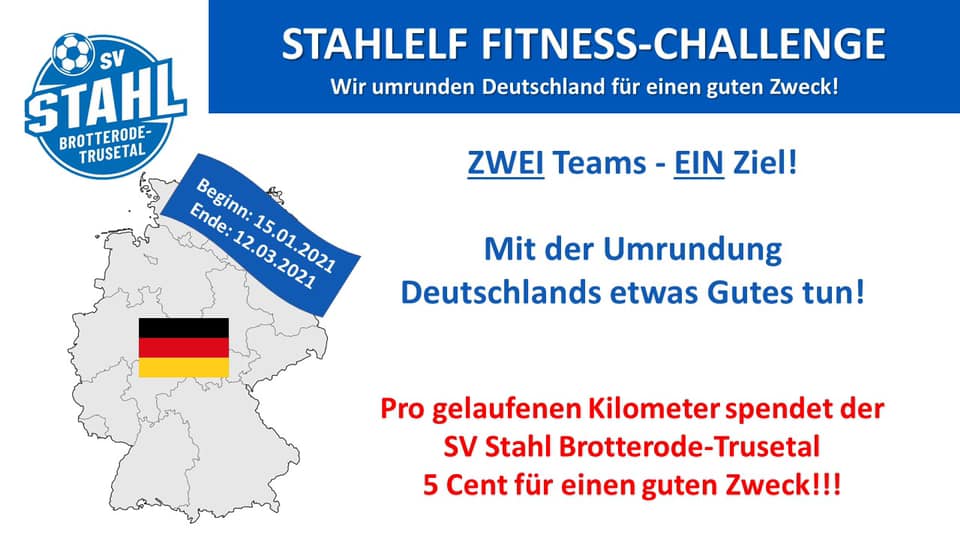 In diesem Sinne machen sich die Mitglieder des SV Stahl Brotterode-Trusetal in zwei Teams auf um virtuell Deutschland zu umrunden. Neben einem tollen Wettkampf und Steigerung der Fitness, wollen wir auch einen guten Zweck in diesen schwierigen Zeiten unterstützen. Pro gelaufenen Kilometer fließen 5 Cent in eine Kasse, welche anschließend einem guten Zweck gespendet wird. Welcher das ist, entscheidet das Siegerteam. Auf geht’s Stahlelf!