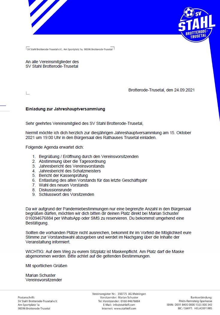 Der SV Stahl Brotterode-Trusetal e.V. führt am Freitag, dem 15.10.2021 um 19.00 Uhr seine Jahreshauptversammlung durch. Dazu sind alle Vereinsmitglieder herzlich in den Bürgersaal im Rathaus der Stadt Brotterode-Trusetal eingeladen. Aufgrund der Bestimmungen der Corona-Pandemie ist eine Voranmeldung der teilnehmenden Mitglieder erforderlich. Hierzu bitte auch die Hinweise aus der Einladung beachten.