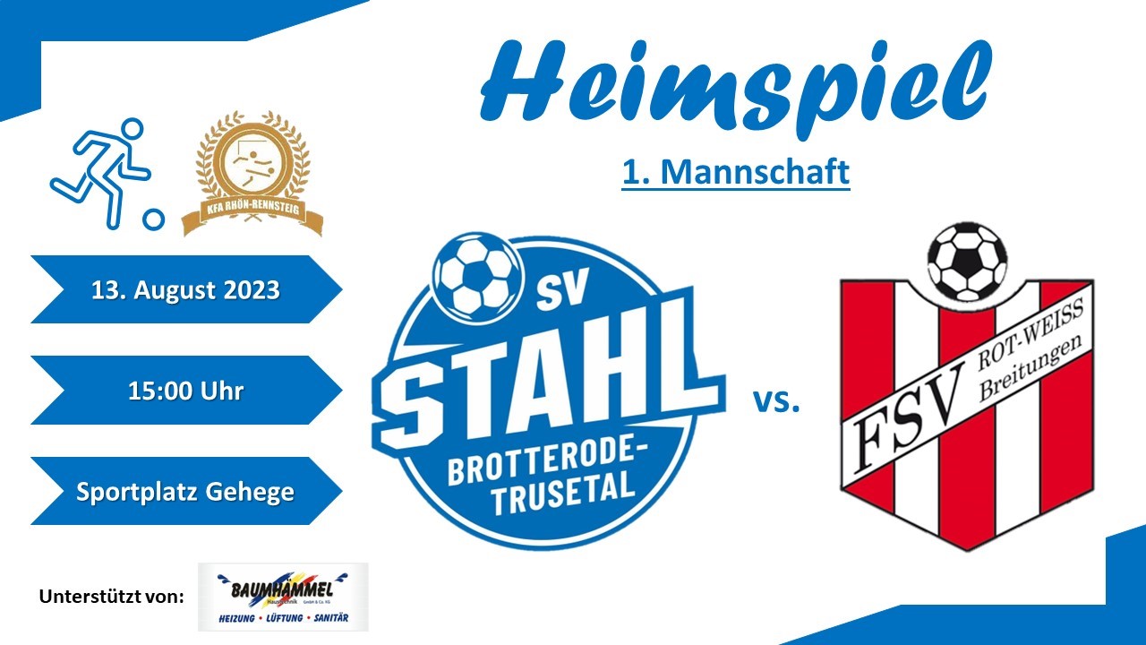 Nun steht am Sonntag der 2.Spieltag der Kreisoberliga und das erste Heimspiel der Saison auf dem Plan. Hier kommt es gleich zum Nachbarschafts-Duell mit Rot-Weiß Breitungen, die in der Vorwoche ihren Auftakt gegen Struth-Helmershof knapp verloren haben. Unsere Mannschaft möchte vor heimischen Publikum natürlich den ersten Dreier einfahren, was aber sicher nicht einfach werden wird. Im Frühjahr kassierte unser Team in Breitungen einen unnötige Niederlage und möchte es nun natürlich auf eigenem Platz besser machen. Somit dürfte Spannung garantiert sein. Das Spiel wird am Sonntag um 15.00 Uhr im Trusetaler "Gehege" angepfiffen.