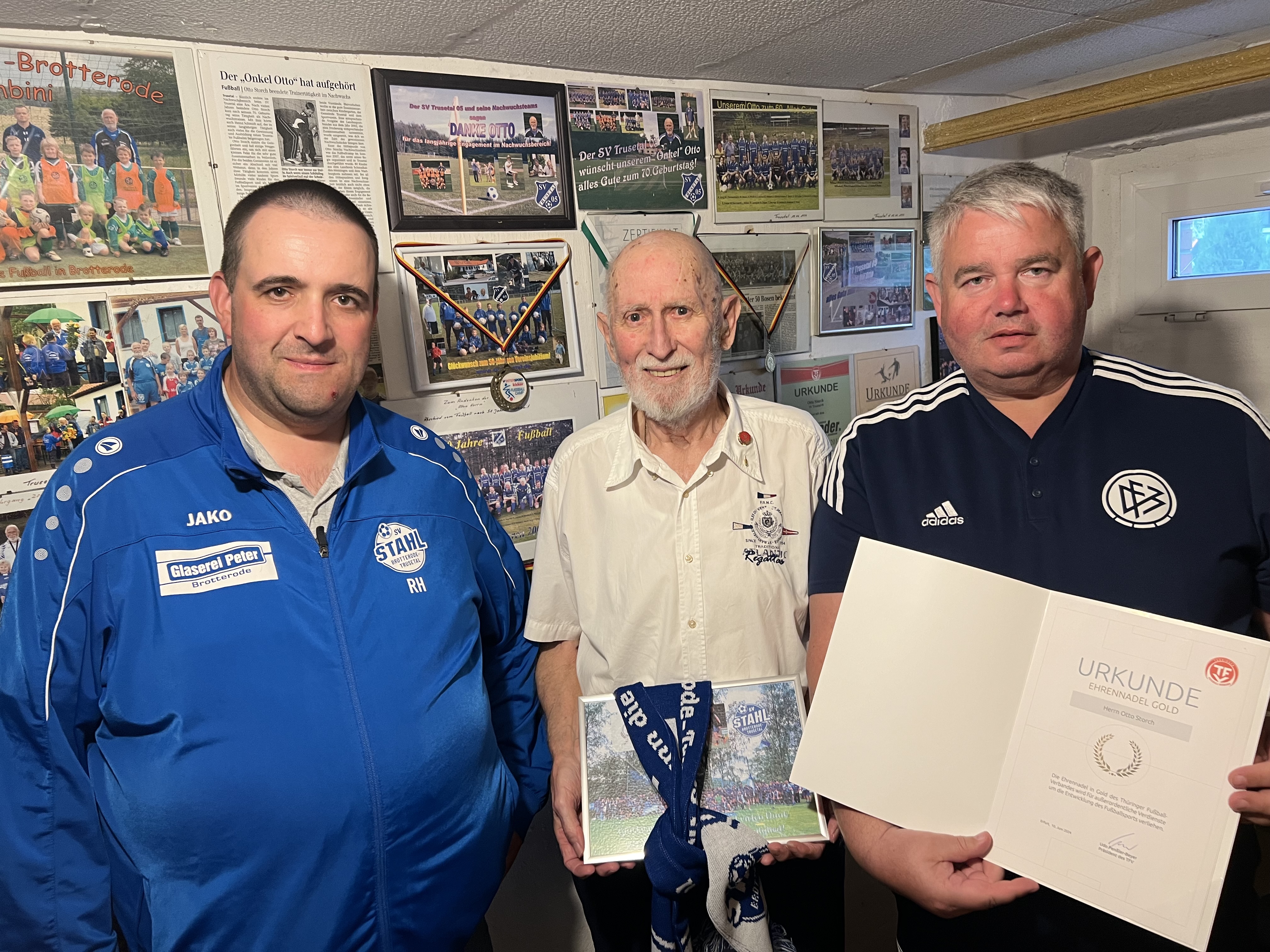 Wenn jemand die Auszeichnung mit der Goldenen Ehrennadel des Thüringer Fußballverbandes verdient hat, dann der Trusetaler Otto Storch. Am 10.Juni, dem Tag seines 85.Geburtstages, bekam er diese hohe Auszeichnung in Anerkennung seiner außerordentlichen Verdienste um die Entwicklung des Fußballsports aus den Händen von Sandy Hoffmann, dem Vorsitzenden des KFA Rhön-Rennsteig, überreicht. Der Jubilar hat in diesen Tagen aber nicht nur seinen Geburtstag zu feiern, sondern auch die mittlerweile 70-jährige Mitgliedschaft in seinem Heimatverein. Hierfür erhielt er vom Vorstand des SV Stahl Brotterode-Trusetal eine Grafik mit der Anerkennung seines Vereins überreicht. Otto Storch - eine echte Trusetaler Fußball-Legende.