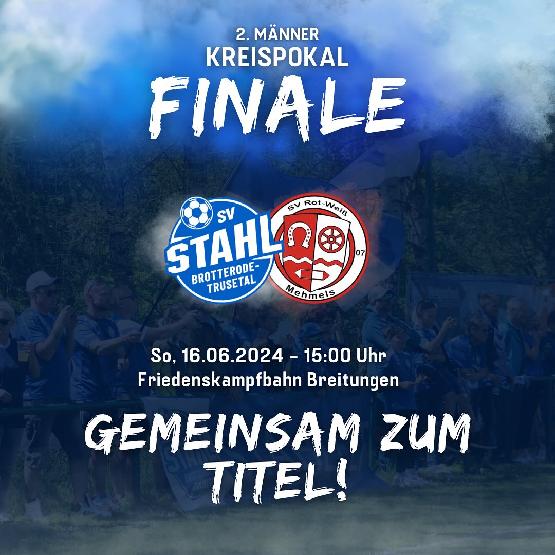 Unterstützt unsere Zweite im Kreispokal-Finale am Sonntag ab 15.00 Uhr in Breitungen! Wie bei der Ersten letzte Woche gilt auch diesmal ALLE IN BLAU nach Breitungen, um historisches zu schaffen! Der letzte Pokalsieg einer Zweiten Mannschaft unseres Vereins liegt schon lange zurück und zwar genau 48 Jahre: im Jahr 1976 gewann die damalige Stahlelf-Reserve das Kreispokal-Finale in Asbach mit 3:0 gegen Herges-Hallenberg. Somit erstmals wieder die große Gelegenheit für unsere Zweite nach fast 50 Jahren einen großen Titel zu holen. Also auf geht´s Stahlelf - Kämpfen und Siegen!