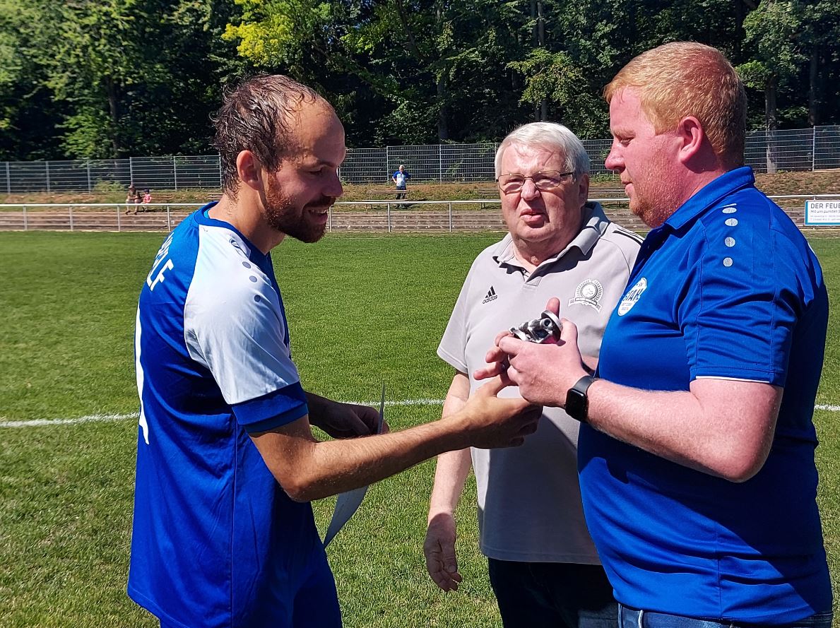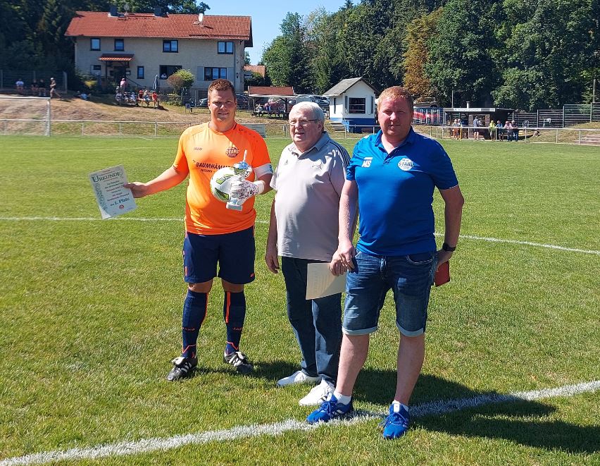 Vor dem Anpfiff unseres Heimspiels gegen Steinbach-Hallenberg II wurden unsere Stahlelf und unser Spieler Brian Peter noch für die vergangene Saison geehrt. Die Ehrung führten der Spielausschuss-Vorsitzende des KFA Rhön-Rennsteig Günter Schuster und unser Vereinsvorsitzender Marian Schuster durch. Neben dem 2.Platz der Kreisoberliga-Saison 2021/22, für den es eine Ball und eine Urkunde gab, wurde unsere Erste Mannschaft noch mit dem Fairplay-Pokal und einer Geldprämie vom KFA Rhön-Rennsteig ausgezeichnet, da unsere Mannschaft einen hervorragenden 1.Platz in der Fairplay-Wertung der Kreisoberliga erreicht hat. Darüber hinaus wurde Brian Peter noch die Torjäger-Kanone für die abgelaufene Saison überreicht. Den Titel des Torschützenkönigs 2021/22 teilt er sich mit Marcel König von der SG Kalten/Rhön, der ebenfalls 18 Treffer erzielen konnte. Unser Torjäger benötigte hierfür allerdings lediglich 15 Spiele, sein Konkurrent aus der Rhön absolvierte 24 Partien. Zu erwähnen ist zudem, dass unsere Dritte Mannschaft in der Fairplay-Wertung der 1.Kreisklasse den zweiten Platz belegte und ebenfalls ausgezeichnet wurde. An dieser Stelle Glückwunsch an unsere Mannschaften und an Brian Peter zu den Auszeichnungen!